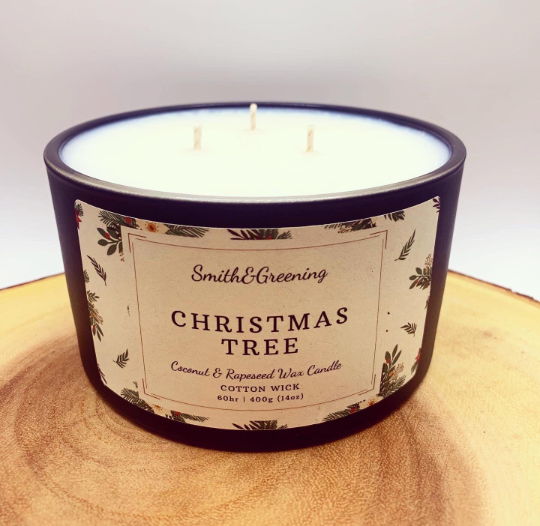 Christmas Tree candle lovingly hand poured in Yorkshire using natural coconut & rapeseed wax, with a choice of eco cotton or wooden wicks. Scented with a festive vegan friendly Christmas tree fragrance oil. Smells just like a real Christmas tree with notes of pine, eucalyptus, cedarwood & sandalwood - perfect for the holidays!