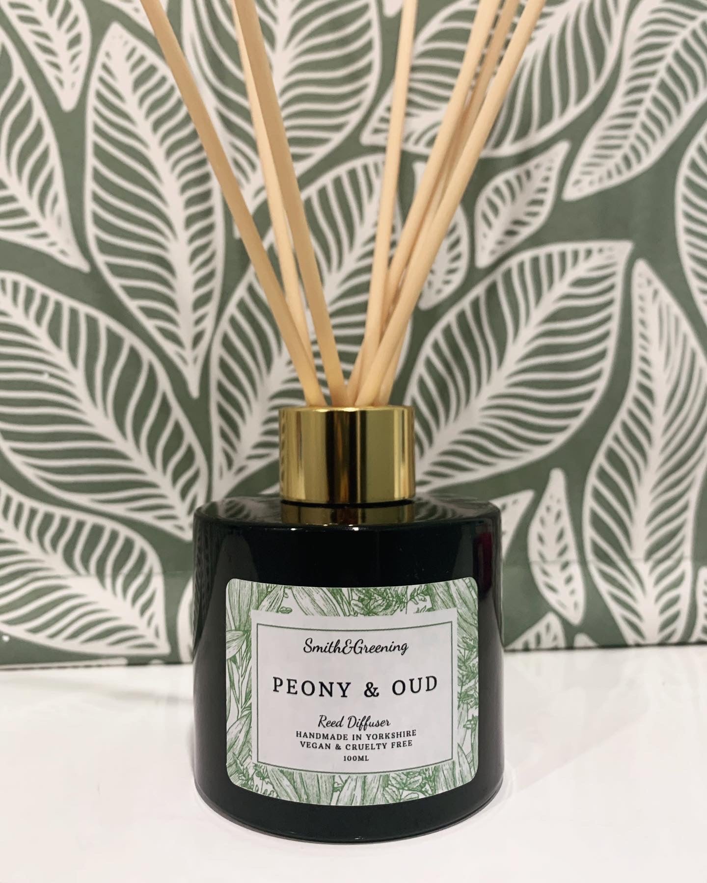 Vegan & cruelty free reed diffuser lovingly hand poured in Yorkshire using an eco-friendly, non-toxic diffuser base and natural fibre reeds. Scented with floral, sweet and woody fragrance oil with notes of Peony, Oud, Rose, Vanilla and Amber.